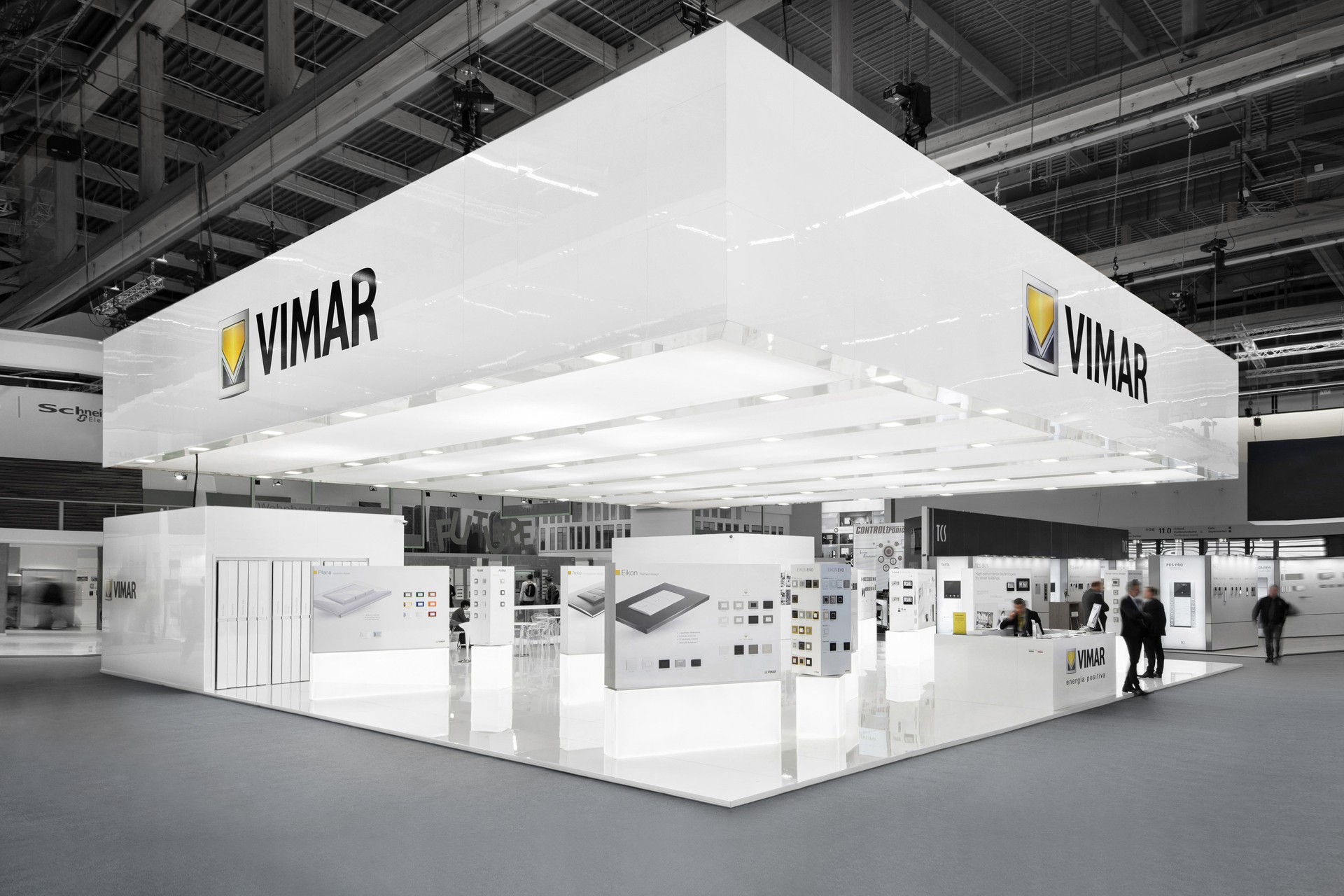 La luce come fonte ispiratrice ed elemento centrale attorno al quale costruire il progetto. Stand ad isola per Vimar che della luce ha fatto la sua ragione di business. Gli espositori prodotto, su base illuminata, hanno la funzione di guidare il percorso espositivo. Studiati come pareti abitative, ospitano scassi per l'alloggio delle placchette. Appendimento con fari ad incasso per una distrubuzione diffusa della luminosità.