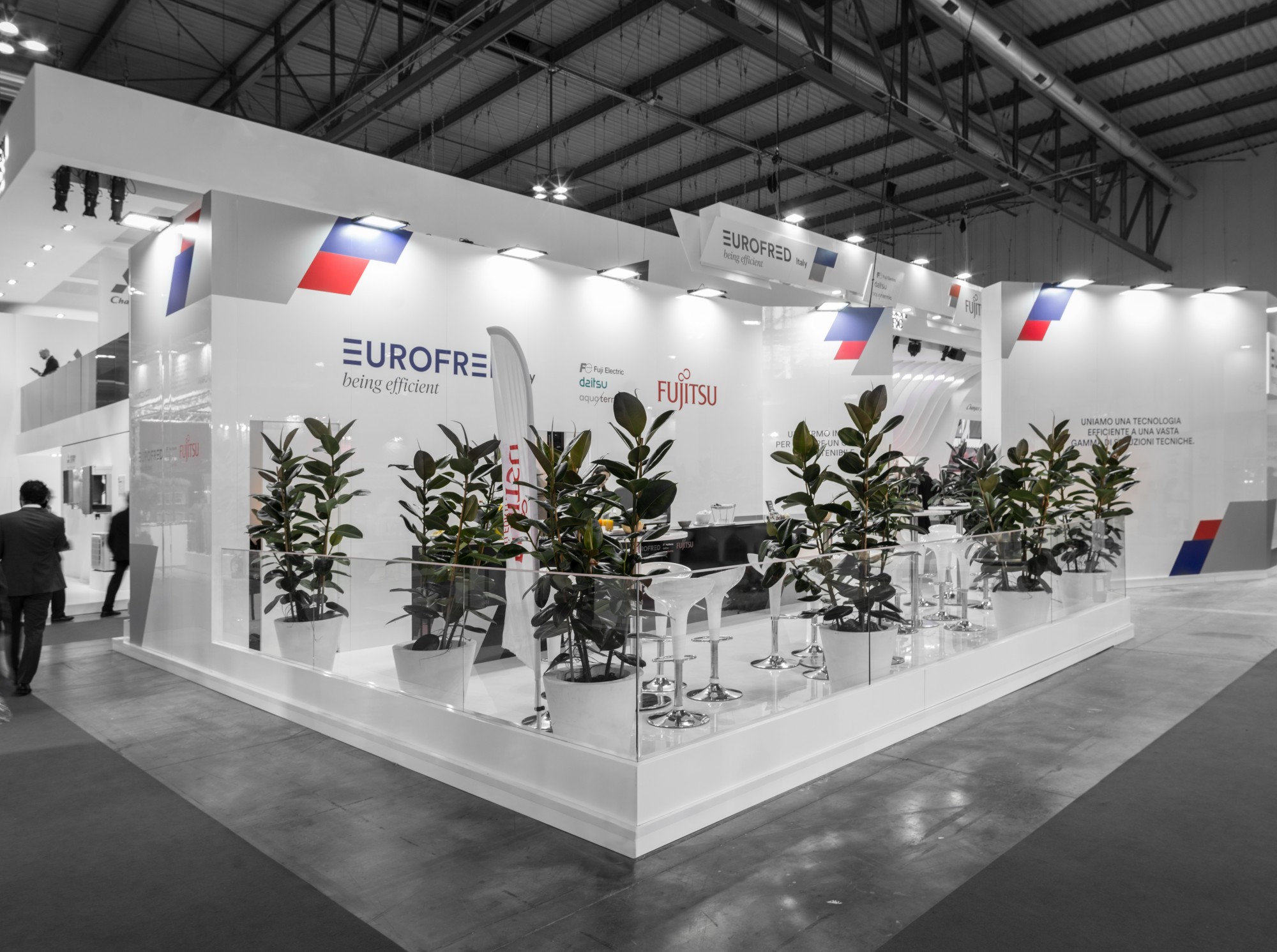Corner espositivo adiacente allo stand Fujitsu; è stato ritagliato uno spazio per l'accoglienza dei visitatori, delimitato da vetrate ed arricchito da piante.