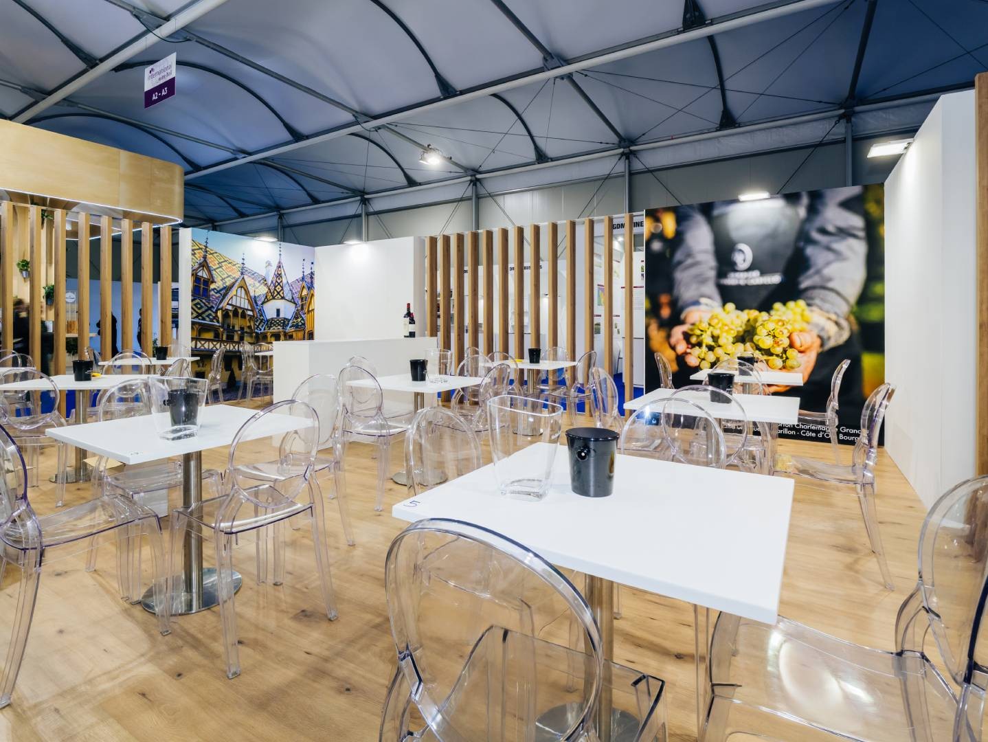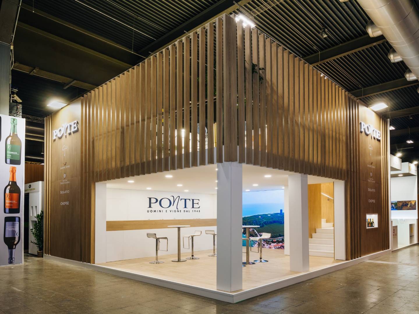 Stand dotato di soppalco si caratterizza per l'utilizzo prevalente del legno, tra gli altri materiali naturali, con il quale vengono realizzate le lamelle che circondano lo spazio, in un'alternanza di aperture e chiusure dall'effetto scenico. L'architettura di forte impatto è protagonista indiscussa di questo stand dal gusto particolamente raffinato.